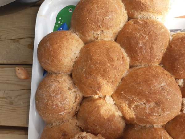 Her ser vi squash kaker, laga av squash dyrka fram lokat, smoothie og heimelaga rundstykker.