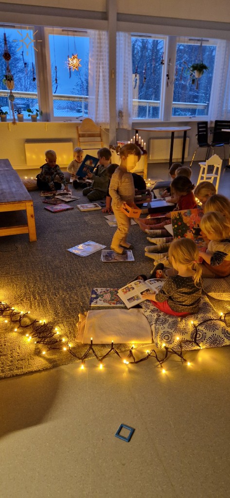 Vi har fokus på språk og høgtlesing denne hausten så vi starta førjulstida med bokbad med julebøker.
